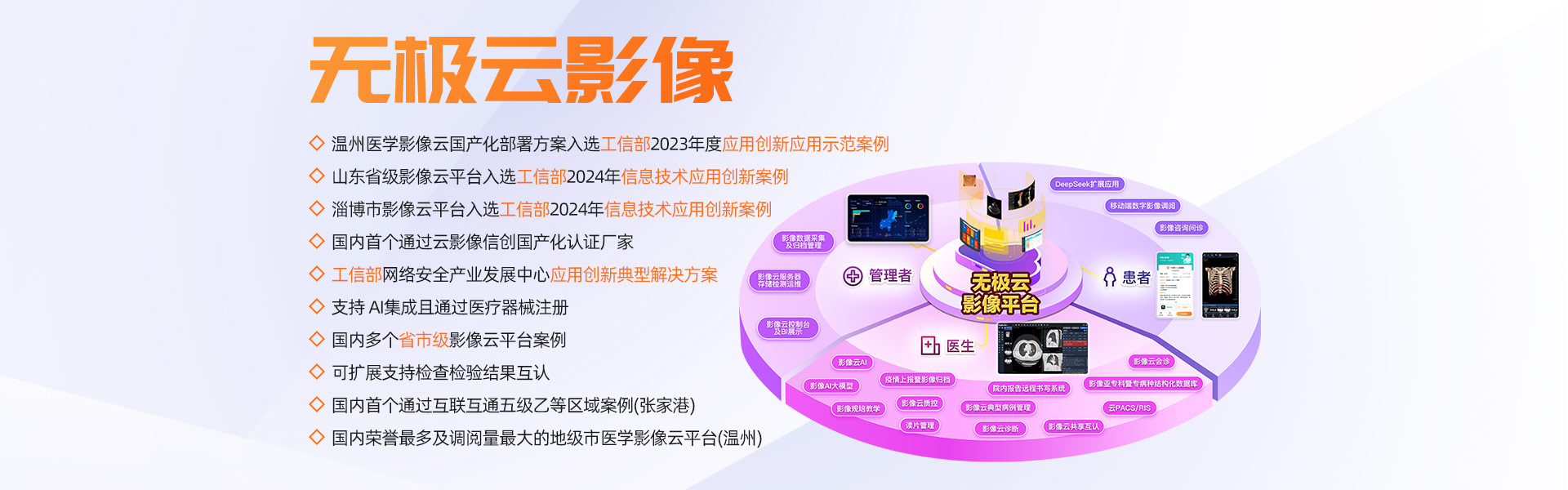 擁有多家年門診量400多萬以上人次的大型三甲醫(yī)院全院PACS及云影像案例,多個(gè)省市規(guī)模醫(yī)學(xué)影像云平臺(tái)案例,承建的溫州市醫(yī)學(xué)影像云平臺(tái)榮獲浙江省最多跑一次改革十佳案例、省領(lǐng)跑者定位題詞、全國(guó)惠民便民優(yōu)秀案例、基于影像云AI分析試點(diǎn)單位等榮譽(yù)。